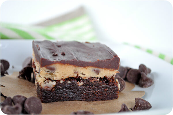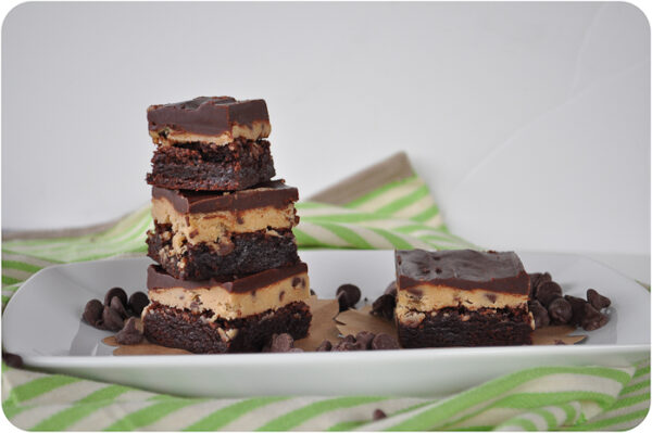 I feel like I’ve been making a lot of cakes (and cupcakes) lately, so this felt like a good change.  I *personally* think they’re a bit over the top and very, very sweet, but the girls and my husband loved them.  It’s really a very simple recipe, you do have to make and bake the brownies but it’s really simple.  The cookie dough layer is eggless and no-bake, and the topping is pretty much just melted chocolate.  It does need to cool and chill between layers, but if you break it up over the course of an afternoon, it doesn’t seem like much effort at all.