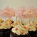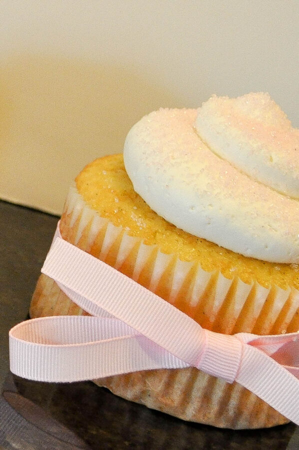 How adorable are these?  I made these for a baby shower and just loved the way they came out.  My new jumbo cupcake pan has just opened up a whole new world of cupcakes for me and I have to say I am loving it.  I love the look of the ribbon tied around the base of the cake – and it’s much easier to do on a jumbo cake than a standard cake.  I found a coordinating pink sugar for garnish and think that these might be one of the cutest cupcakes ever to come out of my kitchen!
