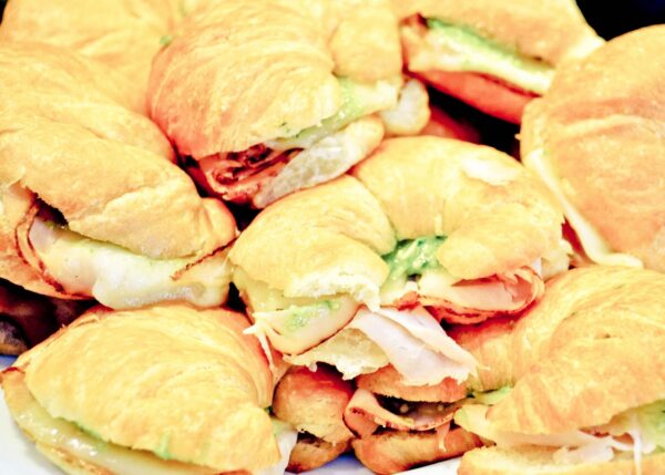 Combine equal parts of mayo and pesto in a small bowl. Melt the butter in another small bowl. Cut croissants open with a large, serrated knife and spread a generous amount of pesto on the top side of the sandwich. Add 1-2 slices of turkey to the bottom of the croissant. Top turkey with cheese and top of sandwich. Place assembled sandwiches on a foil lined baking sheet in a single layer. Brush the tops of the croissants with a generous amount of melted butter.